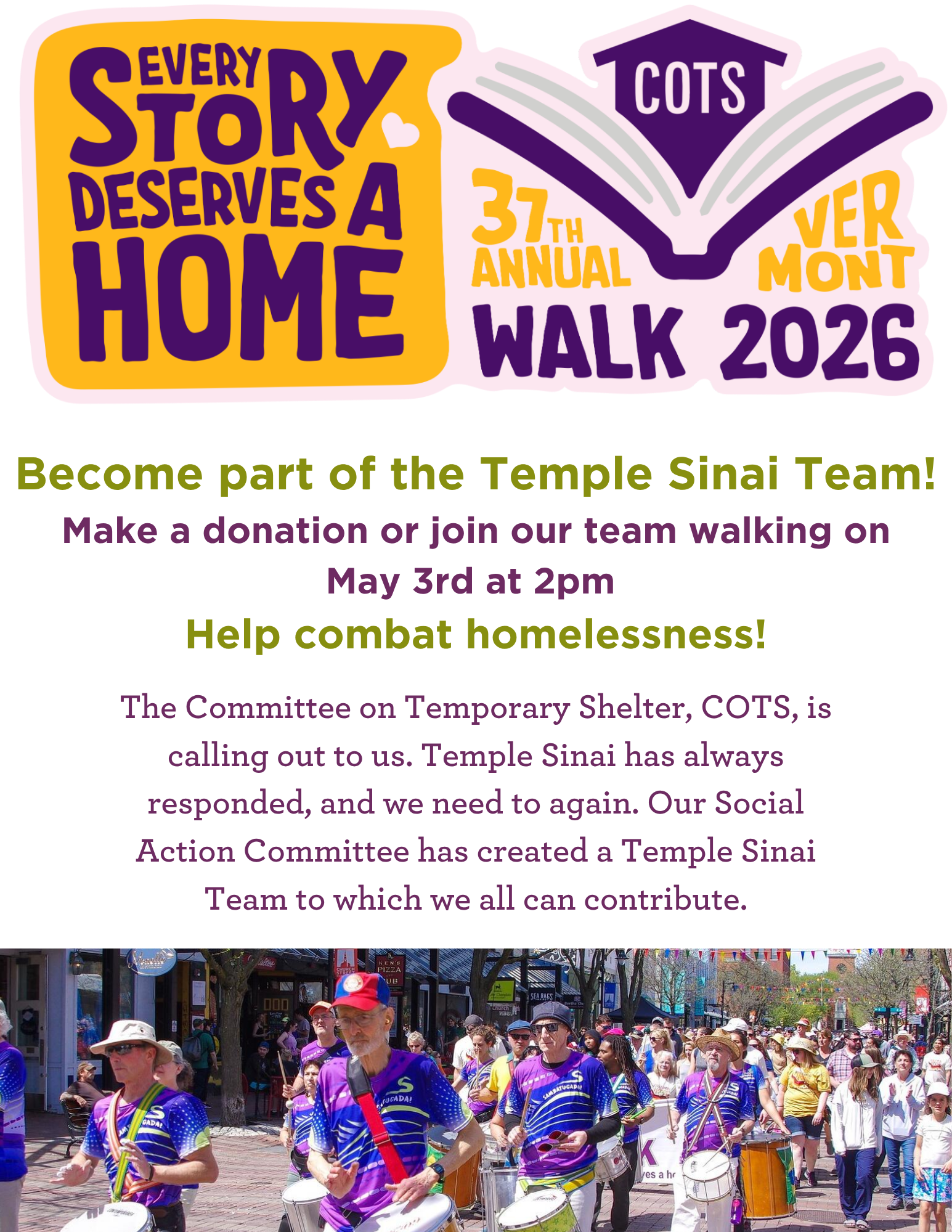 The COTS is calling out to us. Temple Sinai has always responded, and we need to again. Our Social Action Committee has created a Temple Sinai Team to which we all can contribute. Become part of the Temple Sinai Team, make a donation, join us at the COTS walk on May 3rd. Check in is at 1pm and the walk begins at 2pm.