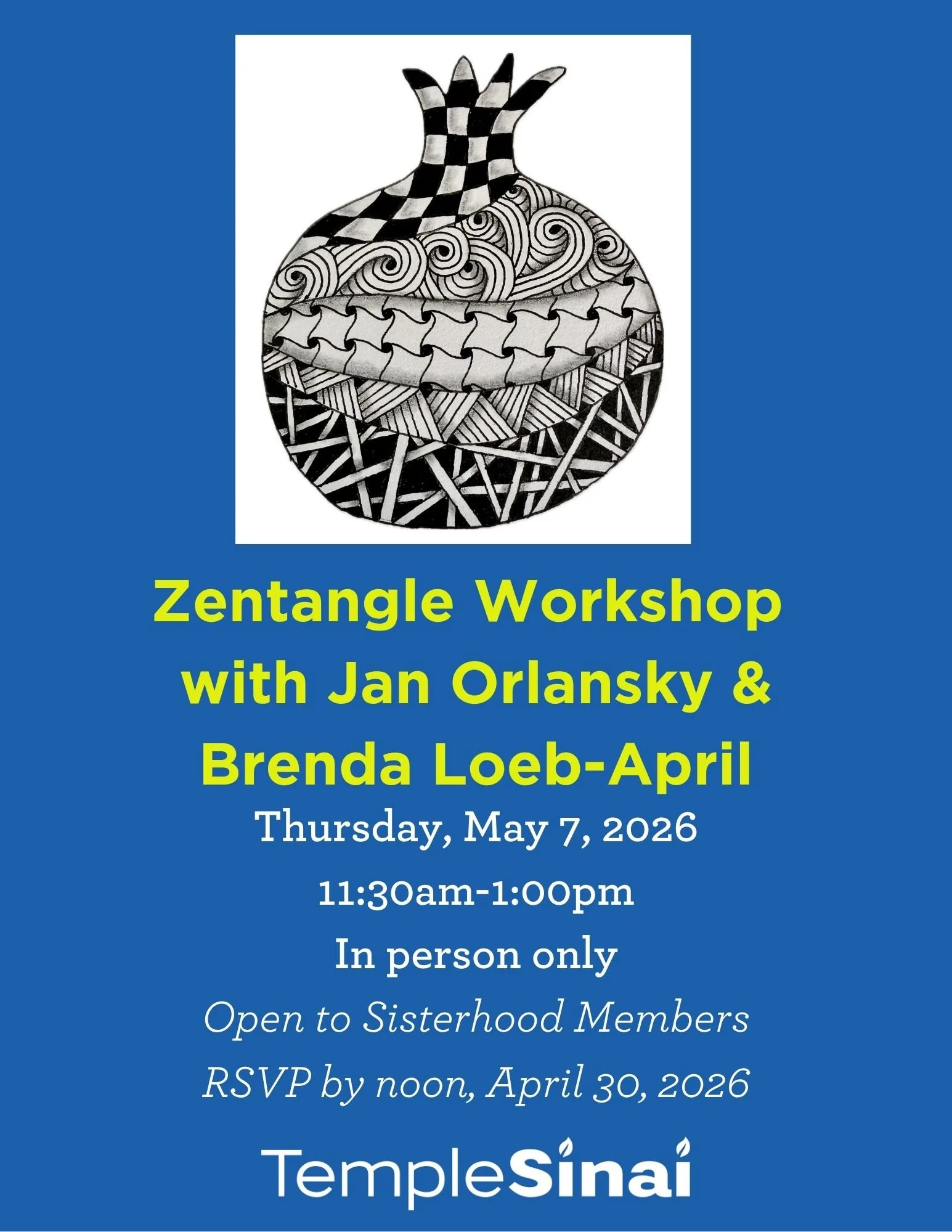 Please register using the REGISTER button on your current Sisterhood Newsletter. You will find this button in the ad for the Zentangle program.