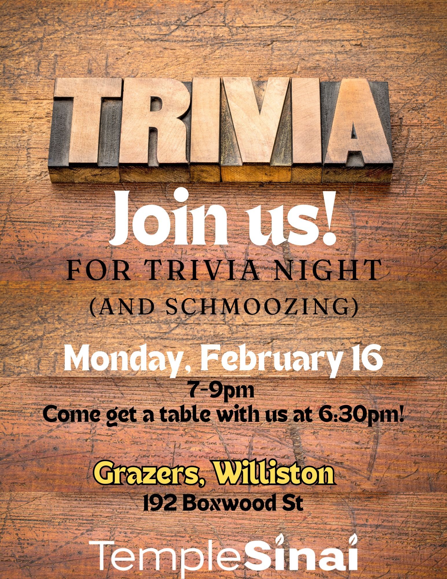 Come hang out and meet other Jews. Meet new friends or bring your own! Share your fund of random knowledge with us as we join Trivia Night at Grazers in Williston (by the movie theater). Trivia starts at 7 pm. Come early and shmooze! No sign up is required but if you want to let us know, you can email Danielle at danielle.levine@templesinaivt.org. We will make teams and tables as people arrive. We suggest arriving between 6:30 and 6:45pm so we can settle in. There will be food and drink available for purchase if you like (but it’s not required).