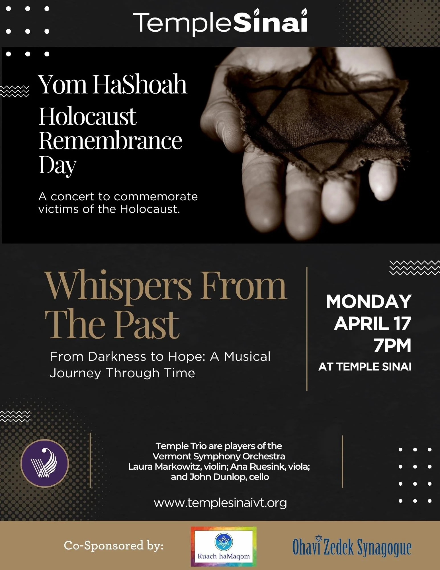 Yom HaShoah - A Concert to Commemorate Holocaust Victims (In Person & Zoom) Monday, April 17, 2023 7:00 PM 8:30 PM Temple Sinai 500 Swift Street South Burlington, VT, 05403 United States (map) Google Calendar ICS Join us in a night of music to remember the victims of the Holocaust.Temple Trio are players of the Vermont Symphony Orchestra (Laura Markowitz, violin; Ana Ruesink, viola; and John Dunlop, cello). Berta Frank will host the event. Zoom Please make sure you have the zoom password before the night of the event.